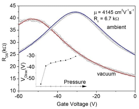 The effect of the pressure variation from high vacuum to ambient conditions on the RDS vs. VGate curve reported in Figure 3a. Solid lines are the fitting curves. Inset: evolution of the Dirac point for increasing pressure.