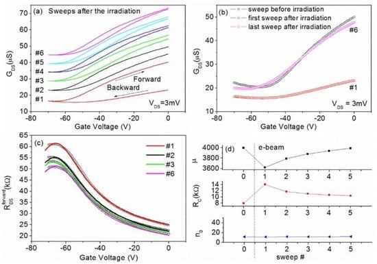 In the following, we consider the effect of electron beam irradiation on the GFETs. In particular, we consider electron beam energy up to 10 keV, i.e., the energy range typically used for SEM imaging. Larger energy (about 30 keV) is normally used for e-beam lithography or imaging in STEM mode. The irradiation was performed on an area of 20 µm × 20 µm, covering most of the graphene channel, with constant beam current Ibeam = 0.2 nA. We used an exposure time of 10 s, which resulted in an electron irradiation dose of about 30 e−/nm2. Differently from other works [27], we performed post-irradiation electrical measurements directly in the SEM chamber, thus avoiding the aforementioned effects of air. Results obtained in six successive electrical sweeps, after a 10 s electron irradiation at 10 keV, are reported in Figure 5a. The complete (forward and backward) sweeping between 0 V and −70 V evidences an important hysteresis that decreases with successive electrical sweeps. The appearance of the hysteresis is easily explained by mobile electrons that are trapped in the gate oxide during e-beam exposure and that screen the gate voltage, while the hysteresis reduction can be caused by their withdrawal by the channel during the successive voltage sweeps [40,41]. By comparing the transfer characteristic before the electron irradiation to the first and sixth sweep measured after the 10 s exposure (Figure 5b), we observe that the device initially has a significant variation in the channel conductance, with considerably reduced gate modulation and reduced carrier mobility, while after successive sweeps it returned to its initial state apart a marginal shift of the Dirac point. To quantitatively analyze the evolution after e-beam exposure (see Figure 5c), we used the model of [32] to estimate the transport parameters, which are summarized in Figure 5d. The carrier mobility is reduced by the 10 s e-beam irradiation from 4000 V2·cm−1·s−1 to about 3600 V2·cm−1·s−1 (as obtained from the first sweep measurement). The initial value is restored by the successive sweeps. A consistent behavior is shown by the total resistance, which is increased by the irradiation and recovers with an increasing number of sweeps. The increase in total resistance, as a consequence of the e-beam irradiation, has also been observed on chemical vapor deposition (CVD) grown graphene [42]. Figure 5d reports the effect of irradiation on the contact resistance that is increased by about 70% by the exposure and is smoothly restored by successive sweeps. Noticeably, the irradiation seems to have a negligible effect on the intrinsic carrier concentration n0. Mobility and resistance degradation can be explained as increased long-range coulomb scattering [43] by electrons stored in the gate oxide during e-beam exposure (damaging of graphene seems to have a minor contribution); such electrons are gradually removed by voltage application during successive sweeps, and pristine conditions are partially recovered.
