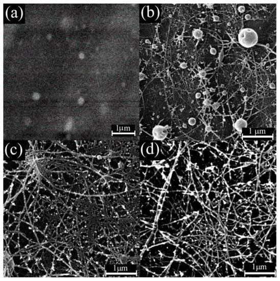 For the coaxial SCH-OUT and mono-axial SDZ/CH samples (Figure 2c,d), the SEM images reveal also a hybrid morphology with a high number of NP stuck/attached on nanofibers with diameters in the 30–40 nm range for both nanofibers and nanoparticles (Table 2). For these two samples the NF mesh is much denser in comparison with that resulting from the coaxial SCH-IN sample.