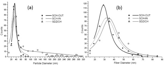 Particle (a) and fiber (b) size distributions for SCH-IN, SCH-OUT and SDZ/CH samples (to facilitate the visualization the data points were interpolated).