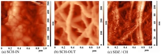 When AFM scanned small areas (500 nm × 500 nm) such big particles were avoided which resulted in much lower roughness for the SCH-IN sample, closer to the roughness of the SCH-OUT and SDZ/CH samples. Thus, at nanoscale the roughness of the SCH-IN, SCH-OUT, and SDZ/CH samples become similar.