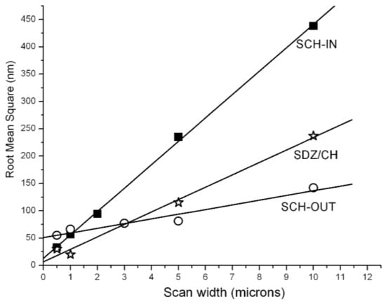 Root mean square roughness (RMS) dependence on the scan width for SCH-IN, SCH-OUT, and CH/SDZ samples.