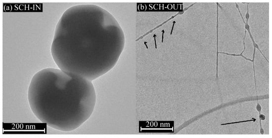 For the SCH-IN sample the TEM images reveal that at least a part of the SCH particles fed into the inner nozzle are encapsulated/surrounded by a very thin layer (10–20 nm) of chitosan (Figure 6a). Due to the presence of the inner SCH particles the chitosan fibers are broken in the early stage of jet forming, leaving a great part of the SCH particles encapsulated with chitosan. For the SCH-OUT sample, the TEM images show thin nanofibers (10–15 nm) and SCH nanoparticles (15–35 nm) stuck, or even confined, as beads along the CH nanofibers. Similar to the SEM results, the TEM images show also SCH particles attached eccentric to the chitosan fiber (Figure 6b). During the electrospinning process of the SCH-OUT sample the integrity of the inner chitosan fiber is not disturbed by the SCH phase during fiber stretching. Thus, the SCH nanoparticles remain either confined in or attached to the CH nanofiber.