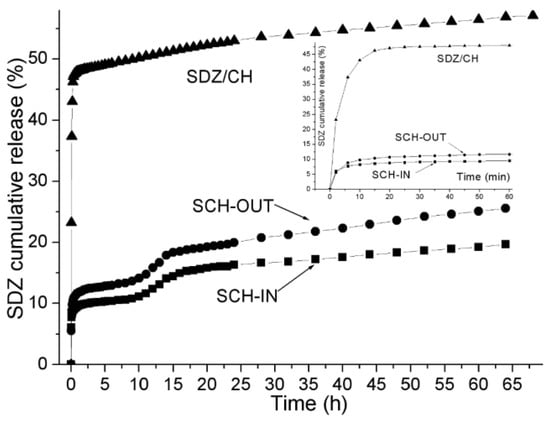 For all studied samples the cumulative release profiles of SDZ show a burst release occurring in the first 20 min followed eventually by a sustained gradual, slow release of the drug. The remaining SDZ would be released along with the errosion/disruption of the CH matrix or of SCH containing nanostructures.