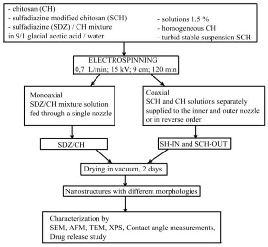 It is known that only CH with sufficient high molecular weight can produce bead-free nanofibers when dissolved in concentrated acetic acid solution [32]. Thus, the fiber forming high molecular weight CH assures the formation of the NF mesh while the SDZ or SCH both in the form of a relatively stable suspension assure the formation of the active NP attached to or encapsulated into the CH nanofiber mesh. The obtained nanostructures were morphologically characterized by SEM (Scanning Electron Microscopy), TEM (Transmission Electron Microscopy), and AFM (Atomic Force Microscopy). The sulfadiazine release profiles and kinetics were analyzed.