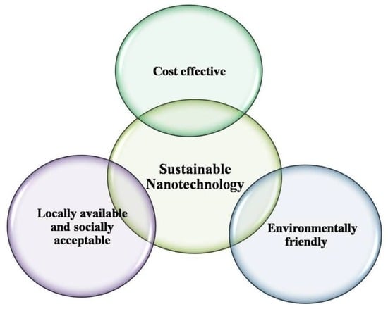 Physical and chemical methods are being used extensively for production of metal and metal oxide nanoparticles. However, this production requires the use of very reactive and toxic reducing agents such as sodium borohydride and hydrazine hydrate, which cause undesired detrimental impacts on the environment, plant and animal life it supports. Researchers continue efforts to develop facile, effective and reliable green chemistry processes for the production of nanomaterials. Various organisms act as clean, eco-friendly and sustainable precursors to produce the stable and well functionalised nanoparticles. These may include bacteria, actinomycetes, fungi, yeast, viruses, etc. [4,5]. Thus, it is vitally important to explore a more reliable and sustainable process for the synthesis of nanomaterials. Economic viability, environmental sustainability, and social adaptability as well as the availability of local resources are a matter of concern in the production of nanomaterials (Figure 1). In order to keep the prices of the final finished nanotechnology-based products affordable to consumers, industries must maintain a delicate balance between environmentally sound green processes and their sustainability. The green nanotechnology-based production processes operate under green conditions without the intervention of toxic chemicals.