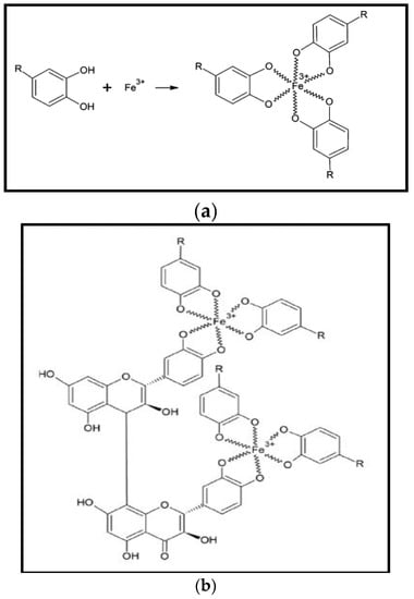 (a) Proposed chemical structure of Fe-P NPs [48]; and (b) proposed condensation mechanism of Fe-polyphenol [63].