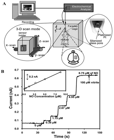 - Jo, A.; Do, H.; Jhon, G.J.; Suh, M.; Lee, Y. Electrochemical Nanosensor for Real-Time Direct Imaging of Nitric Oxide in Living Brain. Anal. Chem. 2011, 83, 8314–8319. [Google Scholar] [CrossRef] [PubMed]