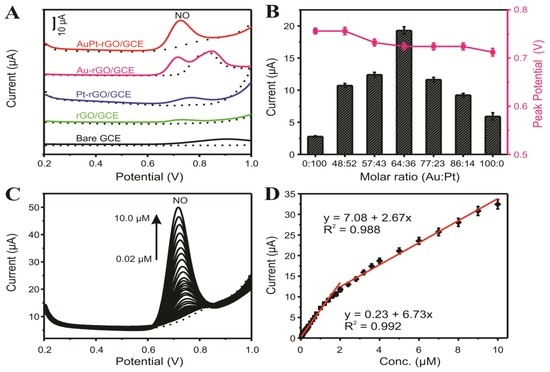 - Liu, Z.; Forsyth, H.; Khaper, N.; Chen, A. Sensitive Electrochemical Detection of Nitric Oxide based on AuPt and Reduced Graphene Oxide Nanocomposites. Analyst 2016, 141, 4074–4083. [Google Scholar] [CrossRef] [PubMed]