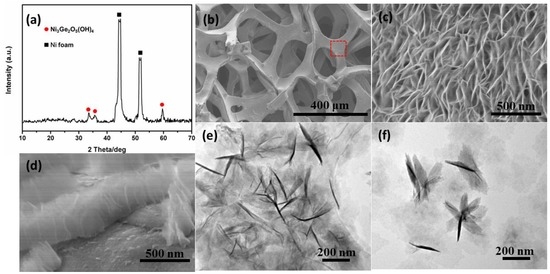 The morphology and structure of the as-prepared products were investigated by different characterization techniques. As shown in Figure 1a, the XRD patterns confirm that one of the constituents for the precursor is Ni3Ge2O5(OH)4. The peaks at 2θ = 33.44°, 35.47° and 59.47° can be well indexed with the (132), (206) and (330) of Ni3Ge2O5(OH)4 reflections (JCPDS No. 11-0097), respectively. However, the molar ratio between Ni and Ge in Ni3Ge2O5(OH)4 precursor (3:2) is lower than that in the final products Ni2GeO4 (2:1). It is possible that this difference arises from the partial constituent of the precursor (Ni(OH)2 with poor crystallinity) [8]. Therefore, the precursor has been estimated to be (Ni3Ge2O5(OH)4)·(Ni(OH)2), which is in accord with the Ni/Ge molar ratio of Ni2GeO4. The energy dispersive X-ray spectroscopy (EDX) analysis has proved that Ni and Ge element exactly co-exist in the precursor (as shown in Figure S1). Figure 1b shows a representative low-magnification SEM image of the precursor supported on a Ni foam substrate. It can be found that the Ni foam remains in a 3D grid structure with hierarchical macro-porosity after the hydrothermal reaction. To further reveal its microstructure, Figure 1c shows a high magnification top-view SEM image of Figure 1b (the region marked). Evidently, the precursor is a layer of uniform nanosheets vertically aligned on the surface of the Ni foam. The thickness of the nanosheet layer is about 400 nm (as shown in the Figure 1d). TEM measurements were carried out to further investigate the structure of as-prepared precursor. This further confirms the nanosheet structure of precursor, as shown in Figure 1e. It can be found that nanosheets exhibit transparent silk-like morphology, indicating the ultrathin nature, which is analogous to graphene. Some nanosheets crosswise assemble to form a petal structure, as shown in Figure 1f. Furthermore, we found that the as-obtained precursors are also highly sensitive to the pH of the mixed solution. Figure S2a,b shows SEM images of the precursor without controlling the pH value (the pH value is about 8.7). Instead of nanosheets, there are only some nanoparticles on the surface of the Ni foam. In addition, the NH4+ and GeO32− are also necessary to form nanosheets. As shown in Figure S2c,d, there are also some nanoparticles on the surface of Ni foam after hydrothermal reaction without adding GeO2. Analogously, the nanosheet does not form during the hydrothermal reaction without adding NH4OH, as shown in Figure S2e. Furthermore, the reaction time also affects the morphology of nanosheets. Figure S3 shows SEM images of samples obtained at different stages of the reaction, 3 and 12 h respectively. It can be found that nanosheets become more and more compact and thick along with the increase of reaction time. When the reaction time is 7 h (shown in Figure 1c), the density and thickness of nanosheet are the most suitable. So we chose 7 h as the reaction time. It should be noted that the nanosheet precursor can also grow in situ on other conductive substrates, such as Cu foil (Figure S4a–d) and stainless steel wire (Figure S4e–h). These results indicate that the current synthesis is a general method, which may be used to prepare other mixed metal oxides.