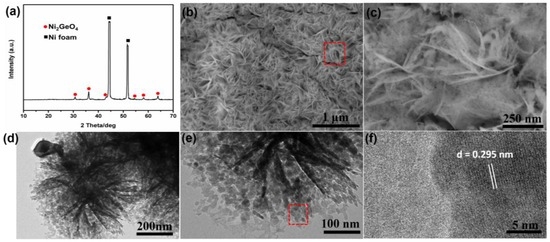 In order to obtain the pure-phase Ni2GeO4 nanocrystals, the precursors were sintered at 700 °C for 1 h under N2 atmosphere. The phase-transformation is quite obvious after heat treatment, as shown in the XRD patterns of Figure 2a. The peaks corresponding to Ni3Ge2O5(OH)4 disappear completely. The six new peaks at 2θ = 30.69°, 36.14°, 43.28°, 54.59°, 58.14° and 63.87° appear, which are well indexed with the (220), (311), (400), (422), (511) and (440) of Ni2GeO4 reflections (JCPDS No. 10-0266), respectively. After conversion into Ni2GeO4, the basic morphology of the samples is conserved without calcination-induced significant alterations, as shown in Figure 2b,c. These as-formed nanosheets are intertwined with each other, which creates loose porous nanostructures with abundant open space for volume expansion and electroactive surface sites. TEM measurements were carried out to further investigate the structure of the as-synthesized samples. The TEM images in Figure 2d,e illustrates that the product retained hierarchical flower-like nanostructures. Due to the much larger lateral size than the thickness, the morphologies of bending, curling, and crumpling are clearly observed. The dark strips are generally the folded edges or wrinkles of the nanosheets. Moreover, it can be clearly seen that numerous inter-particle mesopores with a size ranging from 5 to 15 nm are generated after the heat treatment owing to the loss of high contents of OH− groups in the precursors. The lattice spacing of nanoparticles is about 0.295 nm in the HRTEM images (Figure 2f), which corresponds well with the characteristic (220) planes of fluorite phase Ni2GeO4. It is well known that the mesoporous structures in nanosheets are important to facilitate the mass transport of electrolytes within the electrodes for fast charging/discharging. The porous structure will also greatly increase the electrode/electrolyte contact area and buffering of the volume change during cycling, and thus further enhance the electrochemical performance.