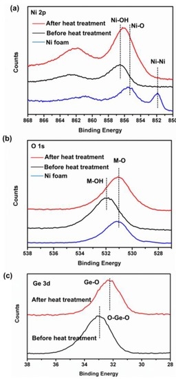The more detailed elemental composition and the oxidation state of the as-prepared Ni2GeO4 are further characterized by X-ray photoelectron (XPS) measurements. Figure 3a shows the Ni 2p emission spectrum. The Ni 2p at 851.8 eV is typical of metal-oxygen (NiO) bonds, indicating that NiO forms on the surface of Ni foam. After growing the precursor on the Ni foam, the Ni 2p shifts to 856.5 eV, because of the formation of Ni–OH bonds [24], which is in accord with the result of XRD (Figure 1a). After heat treatment, the Ni 2p shifts to 856 eV. This is due to the loss of OH− groups and forming of Ni–O bonds at high temperature. It should be noted that the binding energy of Ni 2p in Ni2GeO4 is higher than that in NiO, which is characteristic of Ni3+. Figure 3b shows the O 1s emission spectrum. It can be found that the changed trend of O 1s is similar to that of Ni 2p, indicating a process of dehydration during heat treatment [25]. Figure 3c shows the Ge 3d emission spectrum of as-prepared samples. The binding energy become lower after heat treatment [26], indicating the forming of Ge2+. It may be caused by the redox reaction between Ge4+ and Ni2+ at high temperature. These data show that the surface of the as-prepared Ni2GeO4 has a composition containing Ge4+, Ge2+, Ni2+ and Ni3+.