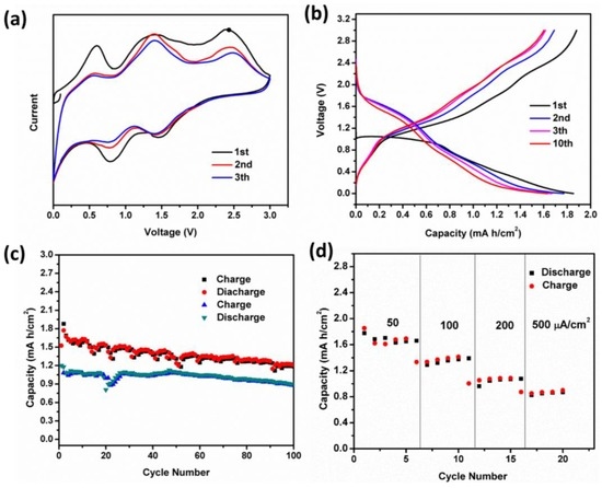 Figure 4b shows the discharge-charge voltage profiles cycled under a current density of 50 μA·cm−2 over the voltage range of 0.01–3 V vs. Li+/Li. The initial discharge and charge areal capacities are 1.85 and 1.9 mA·h·cm−2, respectively. It should be noted that the charge capacity is higher than discharge, which is due to the oxidation of Ni on the surface of Ni foam at high voltage. After the first cycle, the discharge profile can be divided into three parts: the initially sloped area between 2.0 and 1.0 V stems from the insertion of Li+ into Ni2GeO4, because of a typical solid solution reaction [32,33,34]. This is followed by another sloped area from 1 to 0.4 V, which is due to the electrochemical decomposition of Ni2GeO4 to Ni and Ge through a conversion reaction. Finally, the sloped area from 0.4 to 0.01 V is assigned to the delithiation of Li-Ge alloys, according to the results of CV test. It can be found that the first discharge profile is not in keeping with the CV curve and the following discharge profiles. This is a universal phenomenon for metallic oxide [35,36,37,38]. It is worth noting that there is a discharge sloped plateau at about 1.5 V (after first cycle) with a capacity 0.7 mA·h·cm−2. So Ni2GeO4 is also a promising cathode material with high capacity for Li-ion batteries.