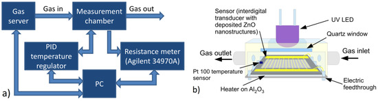 ZnO nanostructures were investigated in various gaseous atmospheres and under various environmental conditions (at different temperature and UV lighting). This required a special measuring chamber, in which the transducer with the deposited ZnO nanostructures was placed (Figure 1b). This measuring chamber can heat the structure by means of a thick-layer heater on an Al2O3 substrate and can measure the temperature by a Pt-100 sensor. A quartz window and an ultraviolet LED (λ ≈ 390 nm) permits the illumination of the sample by means of UV radiation. The transducer mounted on the heater was mobilized on a special chip, and the contacts between its leg and the transducer electrodes were constructed by means of wire bonding (gold wire with a diameter of 25 μm) using the bonder 53XX-BDA (made by F&K DELVOTEC, Braunau, Austria). The cover of this chamber consists of PTFE and is equipped with fast gas connectors of stainless steel. The block scheme of the measurement setup is shown in Figure 1a. The acquisition of data and control of the measurements were accomplished by a PC. The temperature was controlled and measured by the PID controller SR94 (produced by Shimaden, Tokyo, Japan). In all these cases, the resistance was measured making use of a multichannel switch unit 34970A (produced by AGILENT, Santa Clara, CA, USA).