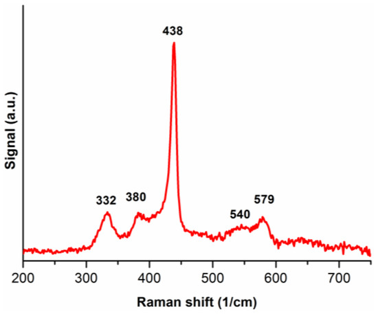 Figure 4 presents the Raman spectrum of ZnO nanostructures. The obtained spectrogram is compatible with Raman peak values for ZnO nanocrystals given in the reference [6] with slight drift (in the range of 2–5 cm−1) caused by different crystals sizes. In this case all the atoms occupy C3v sites. Group theory shows that active Raman modes are A1+E1+2E2. The phonons of A1 and E1 symmetry are polar phonons and, hence, exhibit different frequencies for the transverse-optical (TO) and longitudinal-optical (LO) phonons [6]. Raman modes at 332, 380, 438, 540 and 579 cm−1 are denoted as 2E2, E1(TO), E2, A1(LO) and E1(LO) modes, respectively.