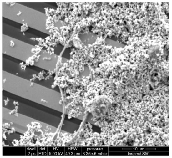 ZnO nanostructures deposited on the IDT have a relatively uniform distribution and good adhesion to the substrate, as may be observed on the SEM image in Figure 5. The adhesion of the nanostructures to the transducer is the result of van der Waals and electrostatic forces. Thus, small grains which have smaller mass to contact area ratio have better adhesion than bigger ones. Long nanowires which have contact to a few electrodes stabilized the electrical properties of the sensor structure. Thanks to the mixture of small grains and nanowires, layers with good adhesion and electrical stability were obtained. The thickness of the layer is not uniform and its value is in the range from single crystalline size up to single micrometers (Figure 5).