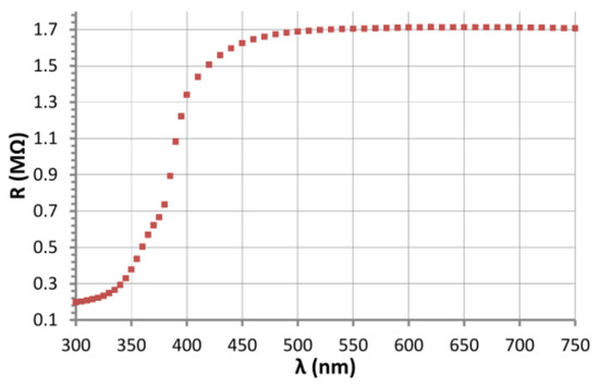 The dependence of the resistance of ZnO nanostructures on the wavelength of optical excitation was measured. The resistance of the ZnO nanostructures was measured during illumination with light in the range from 300 nm to 750 nm. The source of light was a xenon lamp, and the wavelength was measured by tuning the monochromator DH-10 (made by Jobin Yvon, Lonjumeau, France). In this case, the measurements were performed in atmospheric air, at RT. The intensity of light was kept at a constant level and monitored by a spectrometer HR 2000 + ES (made by Ocean Optics, Dunedin, FL, USA).
