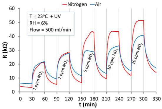 In the case of air conditions both reactions occur and the surface potential is the result of equilibrium between them. In nitrogen only oxygen desorption occurs, and thus the surface potential is smaller than in air. This can be observed in the differences of base resistances under both conditions (Figure 9). This phenomenon has also impact on the kinetics of the reaction of the structure with NO2. Due to the higher oxygen vacancy concentration in nitrogen the structure response is higher than under air conditions.