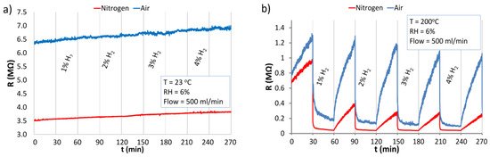 The reaction of ZnO nanostructures with H2 in an atmosphere of synthetic air and nitrogen at RT and at 200 °C is presented in Figure 10. The structure was exposed to relatively high concentrations of hydrogen in the range of a few percent (1% ≡ 104 ppm). The detection of such high H2 concentrations is important because hydrogen is explosive at 4% concentration in air.