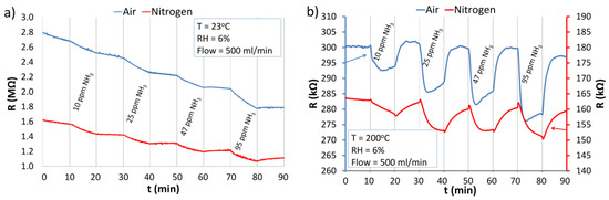 Reactions of the ZnO nanostructures with NH3 in air and nitrogen atmospheres at: (a) RT; (b) 200 °C.