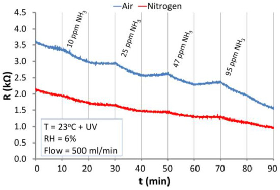 Similar to the case of H2, the interactions of ZnO nanostructures with NH3 were typical for reducing gases (resistance decreases). At the elevated temperature, a relatively fast desorption took place in the atmosphere of air and a comparably slow one in the nitrogen atmosphere. Figure 13 presents the sensitivity of the optically excited (UV) ZnO nanostructures exposed to ammonia in air and nitrogen atmospheres at RT.