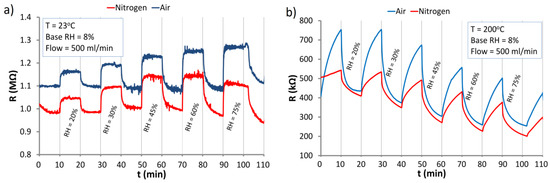 Reaction of the ZnO nanostructures to changes of the relative humidity (RH) level under atmospheres of nitrogen and air at: (a) RT; (b) 200 °C.
