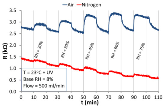 Under UV irradiation at RT (Figure 15), the sensor reacts similarly to the dark conditions at RT (Figure 15a). An increase in the RH level indicates the increase in the resistance of ZnO nanostructures. That proves that UV radiation does not cause dissociative chemisorption of water. As in the case of dark conditions under UV irradiation physical adsorption occurs. In the atmosphere of nitrogen, the structure reacts to RH changes weaker than in the atmosphere of air. This can be explained by the lower concentration of negatively charged oxygen adsorbed on the surface in the presence of nitrogen.