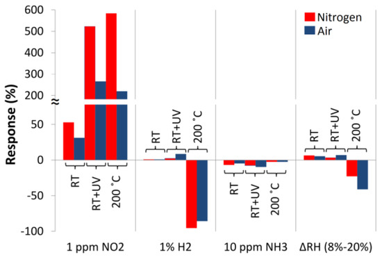 The interactions of ZnO nanostructures with gases showed typical reactions: their electrical conductivity increases when exposed to reducing gases (H2 and NH3), and decreases during exposure to oxidizing gases (O2 and NO2). Generally, at RT, the gas molecules interact with ZnO nanostructures primarily physically (except NO2), while at elevated temperatures, these interactions have the character of chemical adsorption [31]. It has to be stressed that the ZnO nanostructures are particularly sensitive to the presence of NO2 under both atmospheres (air and nitrogen). The response (Equation (1)) of ZnO nanostructure to the effect of NO2 at a temperature of 200 °C is more than 105 times greater than the response of NH3, and more than 106 times greater than that to H2 in the relation of 1 ppm. Thus the selectivity of the structure for NO2 is very good. What is more the selectivity to NO2 at RT with UV excitation increases in comparison to elevated temperature.
