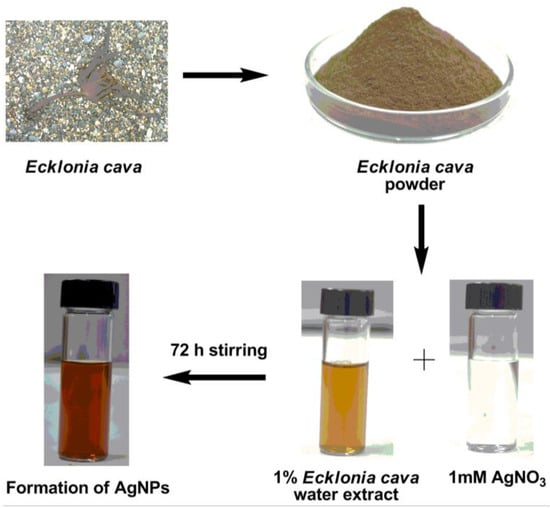 - Mohandass, C.; Vijayaraj, A.; Rajasabapathy, R.; Satheeshbabu, S.; Rao, S.; Shiva, C.; De-Mello, I. Biosynthesis of silver nanoparticles from marine seaweed Sargassum cinereum and their antibacterial activity. Indian J. Pharm. Sci. 2013, 75, 606–610. [Google Scholar] [PubMed]
