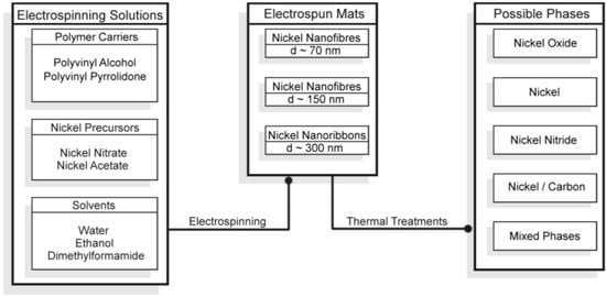 For the preparation of nickel-based electrospun nanofibers, the conventional approach consists of two main steps: (1) the electrospinning of a metal precursor with a carrier polymer (to obtain salt/polymer 1D structures) and (2) the calcination in air of the as-spun materials (to remove the polymer and obtain metal oxide fibers); if metallic nickel is the desired phase, the calcination is followed by the reduction of the oxide to metal fibers. In this work, we started from this route and first investigated the electrospinning solution parameters, namely the metal precursors (nickel acetate and nitrate), the carrier polymers (polyvinylpyrrolidone—PVP—and polyvinylalcohol—PVA—and the solvents (water, ethanol and ethanol with addiction of water or dimethylformamide—DMF). Furthermore, we modified the thermal treatments adding or removing intermediate steps and varying the gas atmospheres. A schematic representation of the general approach we used is depicted in Figure 1.