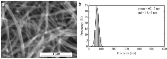A further increase in concentration from 10 wt % to 11 wt % led to instability during the spinning and to the formation of secondary jets together with an increase in ribbon average dimension (Figure 3e,f): thinner fibers can be observed amidst the ribbons of 445 nm (σ = 54 nm) [35]. The large σ values observed for ribbon-like structures is related to a variation in the observable lateral dimension as a function of the angle between the flat side of the ribbon and the SEM point of view; what is measured is the projected surface dimension that does not always coincide with the real dimension.