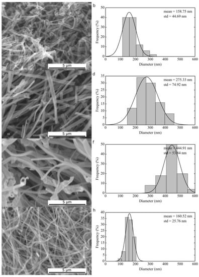 SEM micrographs and corresponding histograms of size distribution of NiO electrospun in the same conditions as 9 (a,b), 10 (c,d), 11 wt % (e,f) polyvinylpyrrolidone and nickel acetate in ethanol (a,b) and in ethanol:dimethylformamide (7:3 vol.) (g,h).