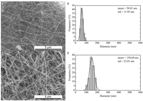 SEM micrographs and corresponding histograms of fiber size distribution of NiO from water/ethanol (a,b) and dimethylformamide/ethanol (c,d).