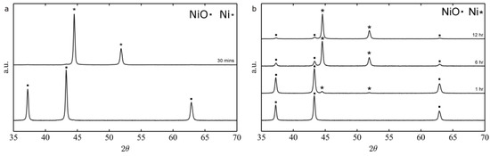 X-ray diffraction (XRD) diffractograms of the conversion of NiO to Ni fibers at 250 °C in pure hydrogen (a) vs. H2/Ar; and (b) Joint Committee on Powder Diffraction Standards (JCPDS) reference: NiO 96-101-0094, Ni 96-151-2527.