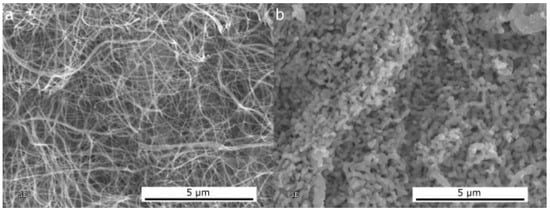Loosely connected ribbons or fibers can be converted into an interconnected sponge-like nanostructure by increasing the reduction temperature: the SEM image in Figure 7 shows the same NiO nanofibers reduced at 250 °C and 400 °C.