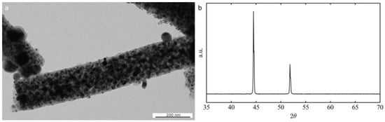 An alternative strategy to the calcination followed by the reduction process described above is the thermal decomposition of a solution of the polymer and the nickel salt at high temperature (700 °C) in inert atmosphere that can directly furnish metallic nickel crystals. This process tends to produce hybrid carbon/nickel materials that can be potentially used as catalysts for hydrocarbon hydrocracking [40] and supercapacitors [41]. From the TEM micrograph in Figure 8a, it is clear that the fibers are constituted of nickel grains in a carbonaceous matrix. The XRD in Figure 8b confirmed that the only crystalline phase present is pure metallic nickel. From thermogravimetric analysis in air, a carbon content of 25 wt % was calculated for the PVP derived fibers. This value can be reduced by replacing PVP with other carrier polymers. As an example, we can cite polyvinylbutyral, leading to a small residual carbon contamination (below 1 wt %).