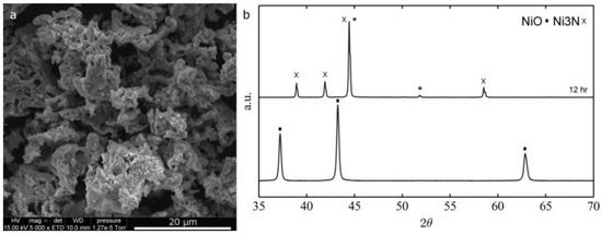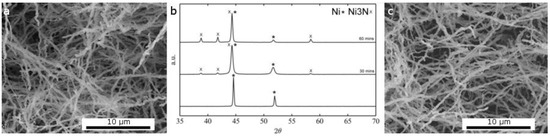 An alternative nickel crystalline phase that received attention for its application for examples in Li-ion batteries, supercapacitors and solar cells is nickel nitride [42,43]. Changing the reducing atmosphere from hydrogen to ammonia and controlling the reaction temperature, it is possible to obtain nickel nitride from nickel oxide or metallic nickel. At low temperatures, the direct conversion in NH3 of nickel oxide to nitride is not possible [44]. On the other hand, at a high temperature, the Ni3N obtained treating the oxide in ammonia is not stable and spontaneously reduces to Ni(0). It is thus possible to obtain Ni3N from NiO by modulating the temperature of the ammonia treatment: first, the oxide is reduced to nickel metal at high temperature (650 °C), and then it is converted to the nitride at low temperature (250 °C) (Figure 9b). The high temperature reduction tends to profoundly change the morphology and the fibrous structure is lost (Figure 9a), giving rise to a sponge-like Ni3N structure.