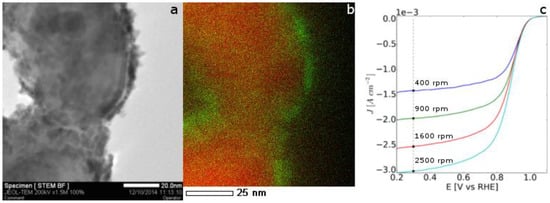 STEM image of platinum on nickel nanofibres after the galvanic displacement (a), overlay of the EDX maps of Ni (red) and Pt (green) (b) and oxygen reduction reaction (ORR) at 5 mV/s in 0.1 M HClO4 saturated with O2 at 400, 900, 1600, 2500 RPM (c).