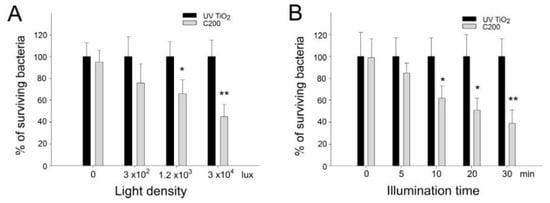 B. subtilis was dissolved in normal saline (100 µL, 1 × 105 CFU/mL) and then incubated with TiO2 and C200 NPs. The bacterial cultures (2.5 × 104 CFU) were mixed with TiO2 or C200 NPs (200 µg/mL in 150 µL of normal saline) using a 200 µL pipetman and placed onto a 24-well cell culture dish. The bacterium–photocatalyst mixtures were then illuminated with visible light (Classictone incandescent lamp, 60 W, Philips; 90 mW/cm2; lamp target distance 10 cm) for 30 min in 24-well plates. After illumination, the bacteria-containing solutions (85 µL) were recovered from the 24-well plates. The bacterial solution was then added into one well of a six-well cell culture dish containing confluent murine macrophage J774A.1 cells (1 × 106 cells/well; MOI: 0.1 bacteria/cell). After phagocytosis was carried out for 1 h, the culture medium was removed, and 200 µL of a cell lysis buffer (100 mM Tris-HCl [pH 7.4], 10 mM MgCl2, 100 mM NaCl, 0.2% sucrose, 0.5% Triton X-100) modified from that described in previous literature [,] was then added to release the cell-engulfed or cell-bound bacteria. A serum-free and antibiotic-free cell culture medium (Dulbecco’s modified Eagle’s medium) was used in this analysis.