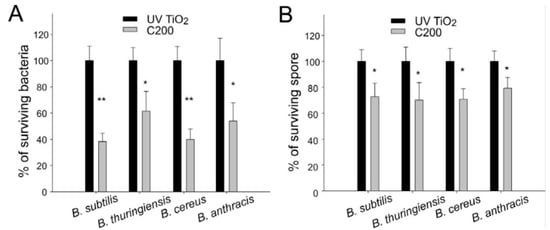 Antibacterial properties of C200 NPs against vegetative bacteria and spores of Bacillus species. Bacteria B. subtilis, B. thuringiensis, B. cereus, and B. anthracis were photocatalyzed using UV100 TiO2 and C200 NPs, respectively. All vegetative bacteria (A) or spores (B) in the UV100 TiO2 groups were normalized to 100%. The relative percentages of surviving pathogens in the C200 groups are shown. The illumination intensity was 3 × 104 lux (90 mW/cm2), and the reaction time was 30 min. * P < 0.05 and ** P < 0.01 compared with respective UV100 TiO2 groups. n = 6, three experiments with two replicates.