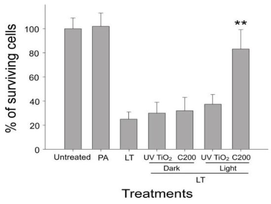 Anthrax lethal toxin (LT), which is composed of two protein components—a protective antigen (PA; cell receptor binding) and a lethal factor (LF; metalloprotease of cellular mitogen-activated protein kinase kinase (MAPKKs, MEKs))—is one of the major virulence factors of B. anthracis []. Anthrax LT can be detected in culture media and spores of B. anthracis. Treatments of LT can lead to the death of macrophage cells in vitro [] and lead to mortality in rodents [,,,,,]. To investigate whether photocatalysis can inactivate the protein components and detoxicate the anthrax toxin, LT was subjected to visible-light-activated photocatalysis on UV100 TiO2 and C200 NPs. As expected, C200 NP-mediated photocatalysis markedly reduced the potency of LT to induce cell death of macrophage J774A.1 cells, when compared with UV100 TiO2 groups (Figure 4). These results suggested that treatment with visible-light-responsive C200-mediated photocatalysis of particular objects not only eliminates the bacteria but also reduces the toxicity of LT.