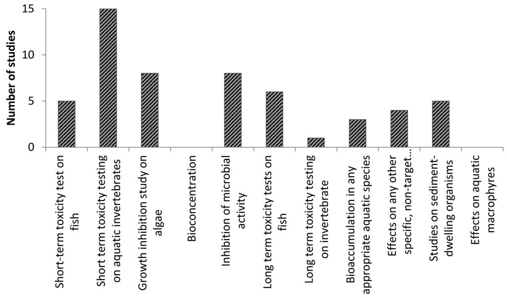 When it comes to providing data to fulfill the different information requirements in the BPR regarding ecotoxicological effects the number of studies vary to a great extent between different organism groups (see Figure 1). For instance, the data contained in the 15 studies available on “Short-term toxicity testing on aquatic invertebrates” are likely to fulfill the BPR requirement, whereas very few data are available on “bioaccumulation in any appropriate aquatic species”. Eight studies are available on growth inhibition on algae and on inhibition of microbial activity, whereas six are available for short term toxicity towards fish. In regard to assessing the long term toxicity of CuO NP, only one study is available on the long term toxicity on invertebrates, whereas four to six studies are available on the other information requirements except for effects on aquatic macrophytes for which no study is available.