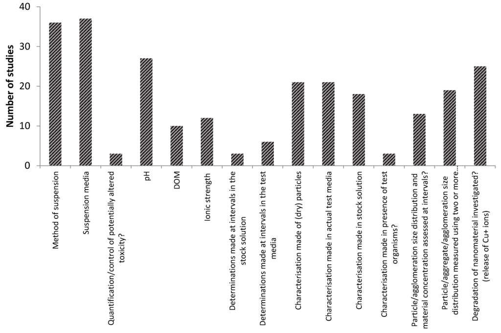 When it comes to following the OECD recommendations for characterization and reporting of the 15 different nanospecific parameters shown in Table 3, the studies vary to a great extent. The studies that report most of the parameters, report on seven to nine of these. However about a third of all the studies report on four or less of the parameters suggested by the OECD. The parameters most often reported on are the method of suspension and the suspension media, which is reported in almost three-quarters of all the studies (see Figure 2). pH and the release of copper ions is reported in the a little more than half of the studies. Characterization of (dry) particles, in the actual test media and in the stock suspension is reported in about one third of all the studies. However, only five studies seemingly characterize the tested NPs in their dry form, in the test media as well as in the stock solution. About a third use two methods to characterize their nanoparticles, but very few use more than two methods. The methods most often used are dynamic light scattering, determination of zeta-potential, Transmission Electron Microscopy and/or Scanning Electron Microscopy. Only about 18% report the particle/agglomeration size distribution and materials concentration measured at different intervals during the test.
