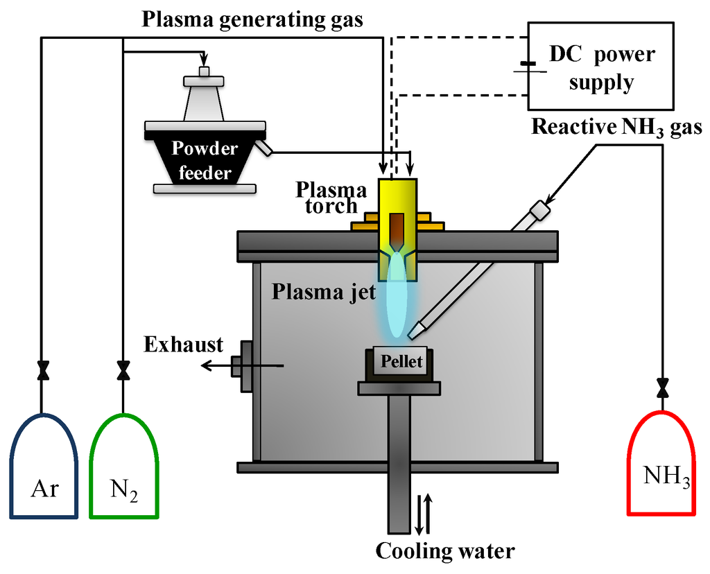 C3H6N6 was decomposed and converted to cyanides, hydrocarbons, and carbon in the high temperature of the thermal plasma jet. Among these, only cyanides have nitrogen elements. However, the nitridation reaction by cyanide molecules is an inferior chemical reaction compared with oxidation. It was examined using the thermodynamic equilibrium calculation in Figure 4c.