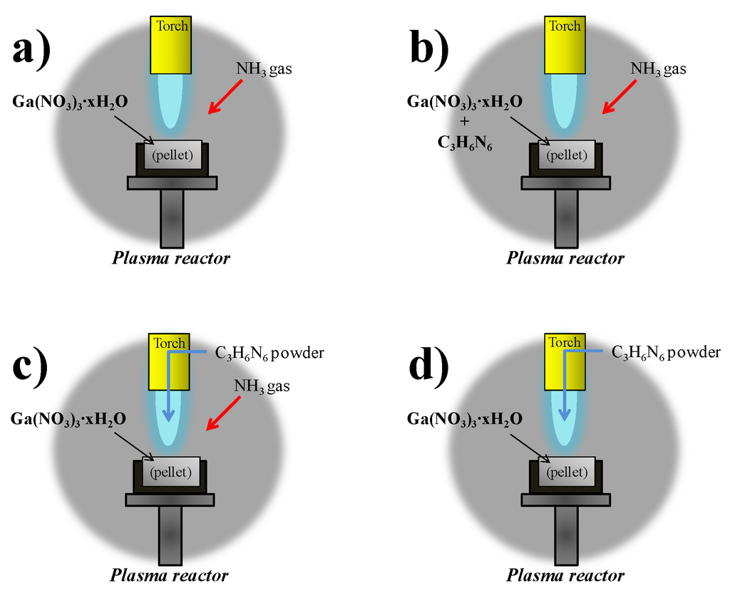 C3H6N6 powder was used in the three different procedures in Plasma 2, 3, 4, and 5. A detailed illustration of C3H6N6 injection methods is indicated in Figure 2a–d. C3H6N6 was mixed with Ga(NO3)3∙xH2O, they were pressed as the pellet precursor in Plasma 2. C3H6N6 powder was injected into the high temperature of the thermal plasma jet as powder through the anode electrode in Plasmas 3, 4, and 5. The molar ratio of Ga(NO3)3∙xH2O and C3H6N6 was controlled at 1:6 and 1:3 in Plasmas 3, 4, and 5. In these cases, NH3 gas was injected into the pellet as a nitridation source by the probe as in Figure 1. Ga(NO3)3∙xH2O was reacted with only C3H6N6 powder and without NH3 gas in Plasma 5, in order to check the possibility of nitridation by the nitrogen element of C3H6N6. The products from thermal plasma were annealed in a vacuum furnace (SH-TMFGF-50, Samheung Inc., Sejong, Korea) to eliminate contamination and to enhance the crystallinity. It was carried out at 850 °C for three hours.