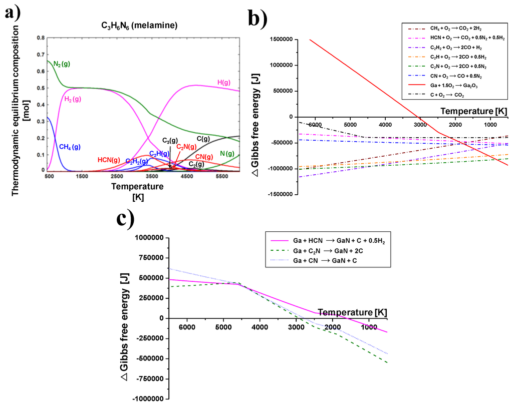 Thermodynamic equilibrium calculation at changes in temperature; (a) thermodynamic equilibrium composition of melamine; (b) change in Gibbs free energy during the oxygen capture reaction of C3H6N6 from Ga(NO3)3∙xH2O; and (c) change in Gibbs free energy of nitridation reaction by decomposed C3H6N6.