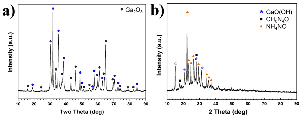 - Jung, W.S. Reaction intermediate(s) in the conversion of β-gallium oxide to gallium nitride under a flow of ammonia. Mater. Lett. 2002, 57, 110–114. [Google Scholar] [CrossRef]
