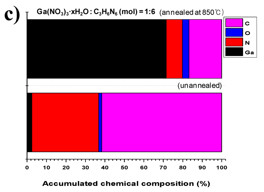 These findings indicate that the nitridation of Ga(NO3)3∙32H2O is difficult without a substance that can consume oxygen as a reductant. Therefore, C3H6N6 powder was used as a reductant to oxidize with the abundant oxygen elements of the Ga(NO3)3∙32H2O precursor.