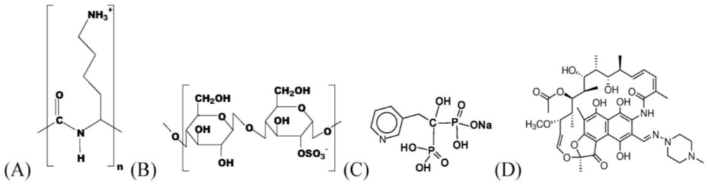Scheme of the mainly used chemical compounds: Poly(l-lysine) (PLL) (A); Cellulose sulfates (CS-0.5) (B); Risedronate (RIS) (C); Rifampicin (RIF) (D).