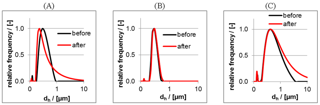 For the PLL/CS-1.0 system (Figure 4B) both very similar and rather narrow size distributions before and after centrifugation were observed in contrast to the PLL/CS-0.5 (Figure 4A) and PLL/CS-3.0 (Figure 4C) system, for which the size distributions broadened or shifted in its maximum after centrifugation. Equal size distributions before and after centrifugation might be interpreted as unaltered colloidally stable PEC particles being completely redispersible after precipitation by centrifugation. In the other two cases (Figure 4A,C) the PEC particles altered with respect to size or size distribution, which can be generally interpreted by less colloidal stability. Reasons might be effects on the conformation of the PEL or on the aggregation state of the PEC particles upon centrifugation, which might occur favorably, when the charge densities of the mixed PEL are very different like for PLL and CS-3.0 or CS-0.5. Obviously, it plays a role, whether polycation and polyanion solution have around the same concentration of charged repeating units like for PLL/CS-1.0 or whether they have different ones like for PLL/CS-0.5 and PLL/CS-3.0. Additionally, there might be a volume effect, since for PLL/CS-1.0 the polycation/polyanion volumes to be mixed are around equal but for PLL/CS-0.5 and PLL/CS-3.0 they are very different. Presumably, the mixing process using very different volumes and charged unit concentrations of polycation and polyanion solution might be more locally and kinetically controlled compared to that using equal volumes and charged unit concentrations.